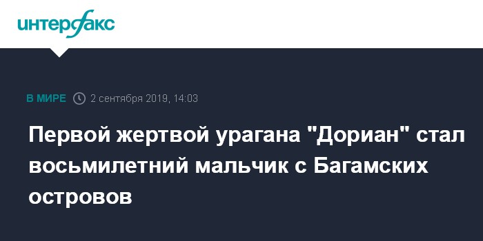 По его данным, жертвой стихии на острове Абако стал восьмилетний мальчик. По словам матери ребенка, ее сын утонул. Если сообщения о гибели ребенка подтвердятся, то он будет считаться первым человеком, погибшим из-за "Дориана", отмечают американские СМИ. Сестра восьмилетнего мальчика считается пропавшей без вести.