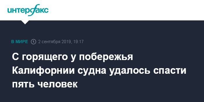 Москва. 2 сентября. INTERFAX.RU - Пять членов команды спасены после пожара на судне близ калифорнийского острова Санта-Крус, еще 33 человека числятся пропавшими без вести, сообщили в понедельник сотрудники Береговой охраны США в твиттере.