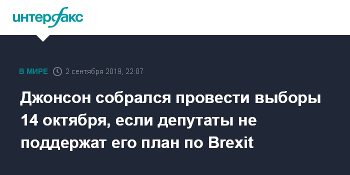 Москва. 2 сентября. INTERFAX.RU - Премьер Великобритании Борис Джонсон намерен организовать 14 октября досрочные выборы в парламент в том случае, если депутаты не станут поддерживать его политику по поводу Brexit, сообщил британский телеканал Sky News со ссылкой на неназванного высокопоставленного представителя британского правительства.
