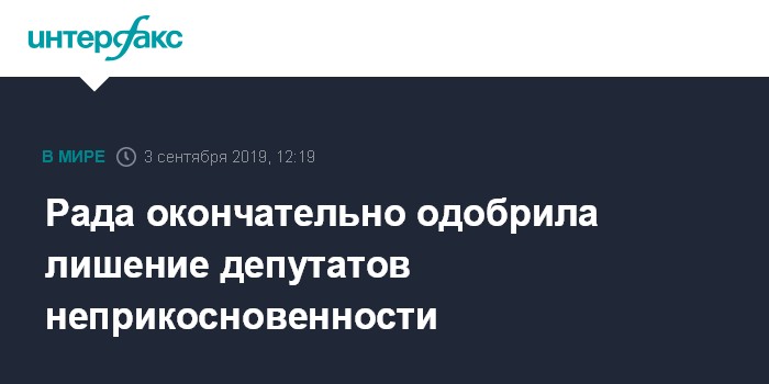 Москва. 3 сентября. INTERFAX.RU - Верховная рада Украины проголосовала за окончательное одобрение законопроекта о внесении изменений в ст.80 Конституции страны, который предусматривает лишение народных депутатов неприкосновенности с 2020 года.