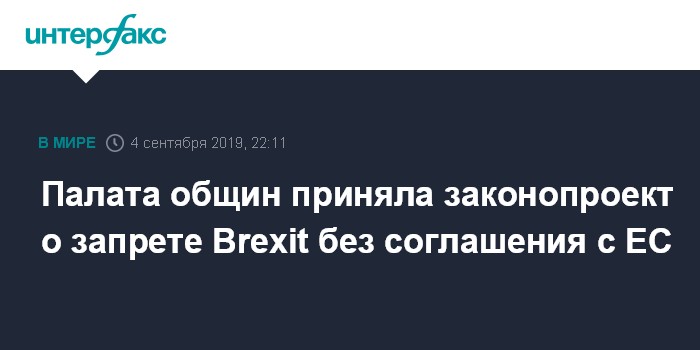 Москва. 4 сентября. INTERFAX.RU - Палата общин британского парламента в среду приняла законопроект, запрещающий Brexit без соглашения с ЕС, сообщает телеканал Sky News.