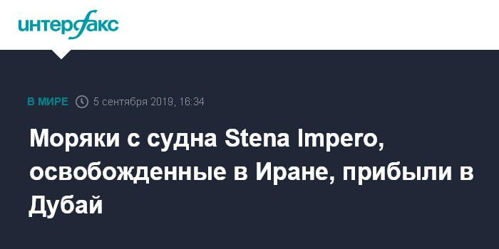 Ранее дипломатический источник сообщал "Интерфаксу", что моряки с Stena Impero покинут Иран 5 сентября и направятся в Дубай. Из-под стражи в Иране членов экипажа судна отпустили днем ранее, 4 сентября.
