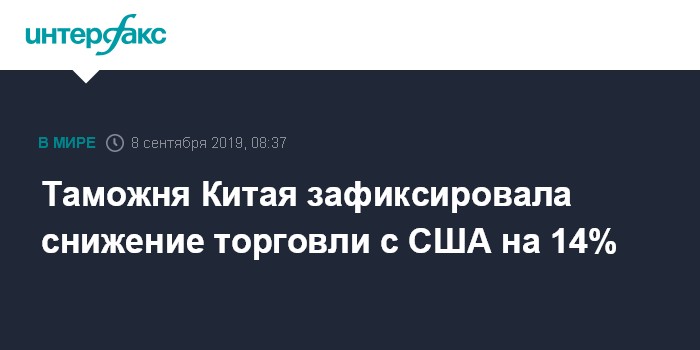 Москва. 8 сентября. INTERFAX.RU - По итогам первых восьми месяцев текущего года объем торговли Китая и США составил $355,6 млрд, сократившись по сравнению с тем же периодом прошлого года на 13,9%, свидетельствуют данные китайской таможенной статистики.