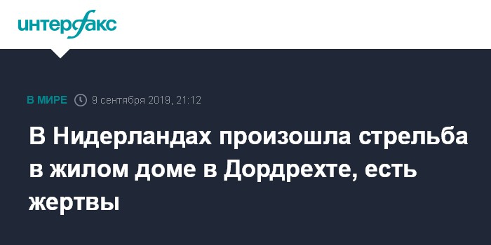 Москва. 9 сентября. INTERFAX.RU - В Нидерландах вечером 9 сентября произошел инцидент со стрельбой в жилом доме в городе Дордрехт. В полиции Роттердама сообщили, что есть погибшие.