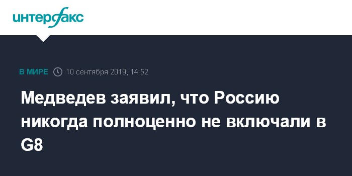 Москва. 10 сентября. INTERFAX.RU - Россию никогда "в полном объеме не пускали" в "Большую восьмерку", еще 10 лет назад этому формату уже недоставало легитимности, заявил премьер-министр РФ Дмитрий Медведев.