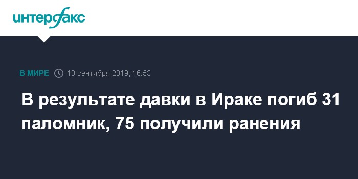 Москва. 10 сентября. INTERFAX.RU - Минимум 31 человек погиб из-за давки в священном для мусульман-шиитов городе Кербела в Ираке, сообщает Аljazeera.