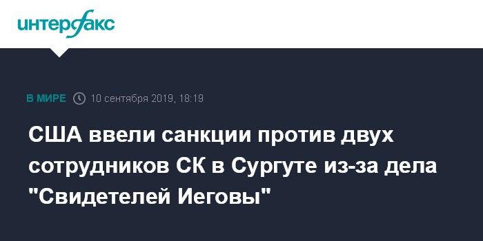 Москва. 10 сентября. INTERFAX.RU - Госдепартамент США сообщил во вторник, что ввел санкции против двух сотрудников СК в Сургуте из-за дела, связанного со "Свидетелями Иеговы" (запрещенная в РФ организация).