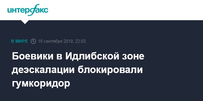 Москва. 15 сентября. INTERFAX.RU - В Идлибской зоне деэскалации в Сирии боевиками блокирована работа гуманитарного коридора "Абу-Эд-Духур", беженцы не могут покинуть зону пропуска, им угрожают оружием, сообщил на брифинге руководитель российского центра по примирению враждующих сторон в Сирии генерал-майор Алексей Бакин.