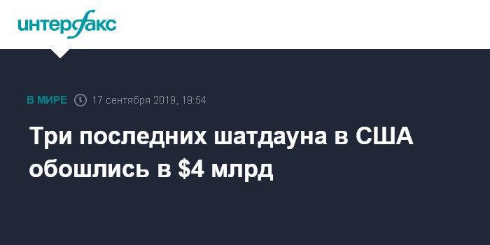 Москва. 17 сентября. INTERFAX.RU - Три последних временных приостановки работы федеральных учреждений США ("шатдаун") обошлись налогоплательщикам страны примерно в $4 млрд, свидетельствуют результаты межпартийного исследования.