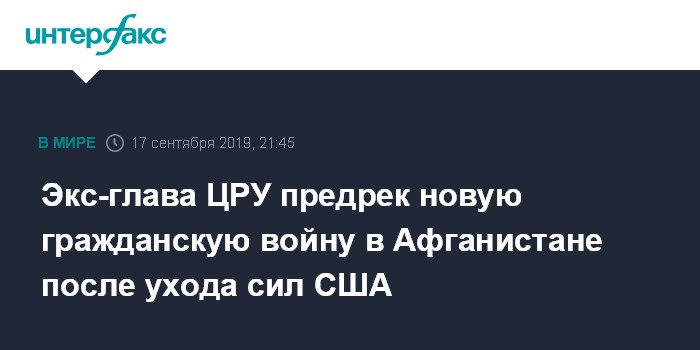 Москва. 17 сентября. INTERFAX.RU - Бывший глава ЦРУ Дэвид Петреус считает, что после ухода американских войск террористическая группировка "Талибан" (запрещена в РФ) может развязать новую гражданскую войну в Афганистане.