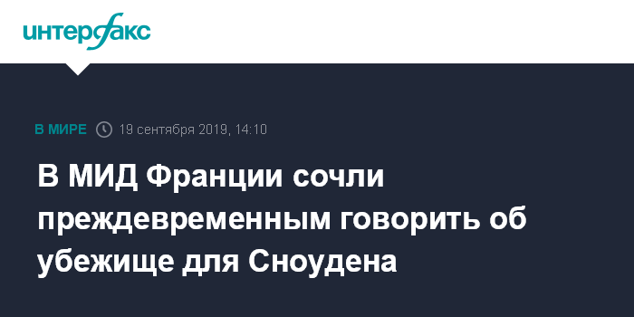 Москва. 19 сентября. INTERFAX.RU - Власти Франции не считают, что в настоящее время страна должна предоставлять убежище бывшему сотруднику Агентства национальной безопасности (АНБ) Эдварду Сноудену, сообщает в четверг агентство Associated Press со ссылкой на главу МИД Франции Жан-Ива Ле Дриана.