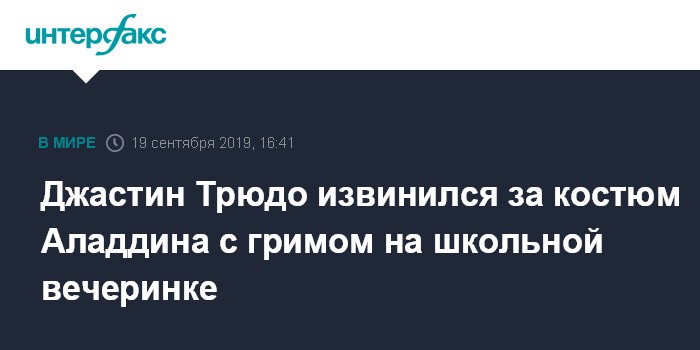 Москва. 19 сентября. INTERFAX.RU - Премьер-министр Канады Джастин Трюдо принес извинения за то, что на вечеринке 2001 года в школе он надел костюм Аладдина и затемнил гримом лицо, шею и руки, сообщает АР. Теперь такой грим считается расистским. Скандал разразился через неделю после того, как Трюдо начал кампанию по переизбранию.