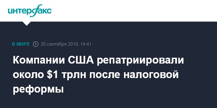 Москва. 20 сентября. INTERFAX.RU - С момента вступления в силу налоговой реформы в начале 2018 года компании репатриировали около $1 трлн зарубежной прибыли. Об этом говорится в сообщении министерства торговли США.