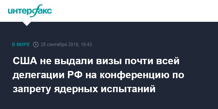 Ранее постпред РФ при ООН Василий Небензя сообщил "Интерфаксу", что США не выдали визы не только российской делегации на 74-ю сессию Генассамблеи ООН, но и делегации на конференцию по ДВЗЯИ.