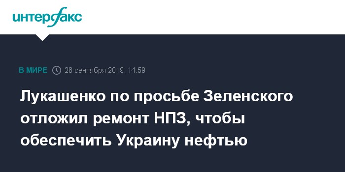 Москва. 26 сентября. INTERFAX.RU - Президент Белоруссии Александр Лукашенко по просьбе украинского лидера Владимира Зеленского поручил перенести плановый ремонт на Мозырском нефтеперерабатывающем заводе (НПЗ), чтобы поставить в соседнюю республику необходимые нефтепродукты.