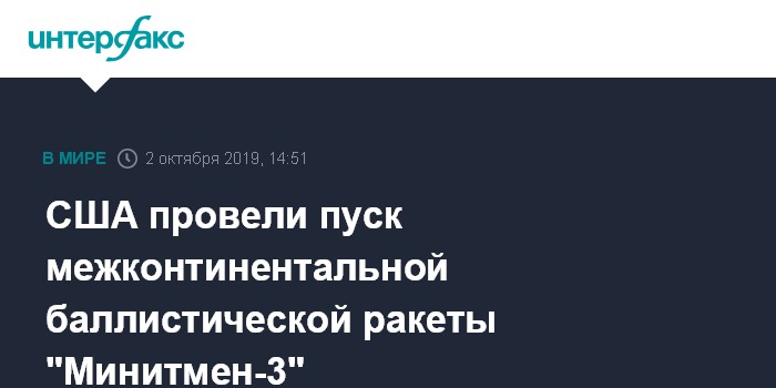 Москва. 2 октября. INTERFAX.RU - Соединенные Штаты в среду осуществили новый испытательный пуск межконтинентальной баллистической ракеты (МБР) Minuteman III ("Минитмен-3"), способной нести несколько ядерных боеголовок индивидуального наведения, сообщило Командование глобального удара ВВС США.