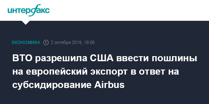 Москва. 2 октября. INTERFAX.RU - Всемирная торговая организация (ВТО) разрешила США обложить пошлинами товары европейского экспорта общим объемом $7,5 млрд в год в ответ на субсидирование Евросоюзом авиастроительного концерна Airbus SE. ЕС будет готов к ответным действиям, заявила еврокомиссар по торговле Сесилия Мальмстрем.