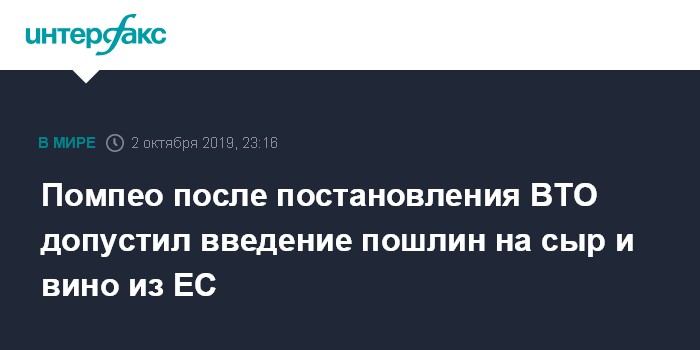 Москва. 2 октября. INTERFAX.RU - Власти США в связи с постановлением Всемирной торговой организации (ВТО) о возможности для Вашингтона вводить пошлины на европейские товары могут применить подобные меры против вина и сыров из ЕС, заявил в среду госсекретарь США Майк Помпео.
