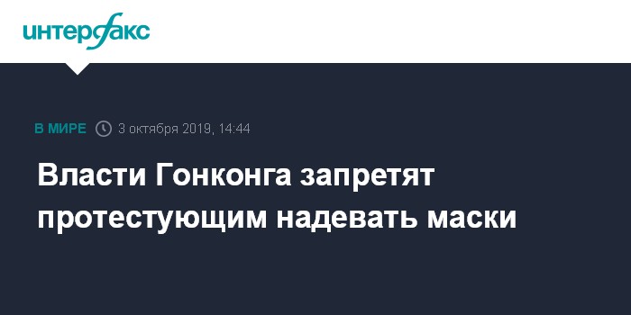 Москва. 3 октября. INTERFAX.RU - Администрация Гонконга в ближайшее время введет запрет на ношение масок на акциях протеста. Глава администрации региона Кэрри Лам созовет для этого экстренное совещание уже в пятницу, 4 октября, пишет местная South China Morning Post со ссылкой на источники.