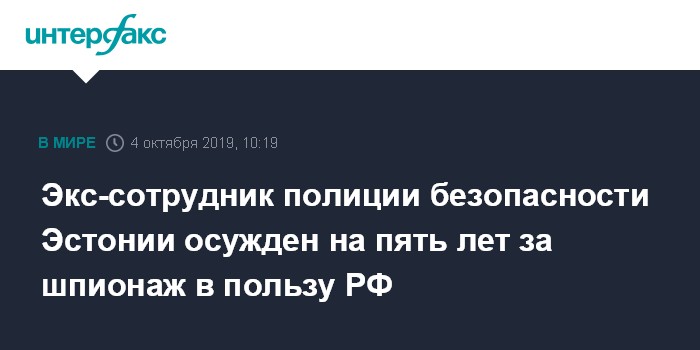 Москва. 4 октября. INTERFAX.RU - В Эстонии к пяти годам заключения приговорен бывший сотрудник полиции безопасности Владимир Куликов за шпионаж в пользу России.