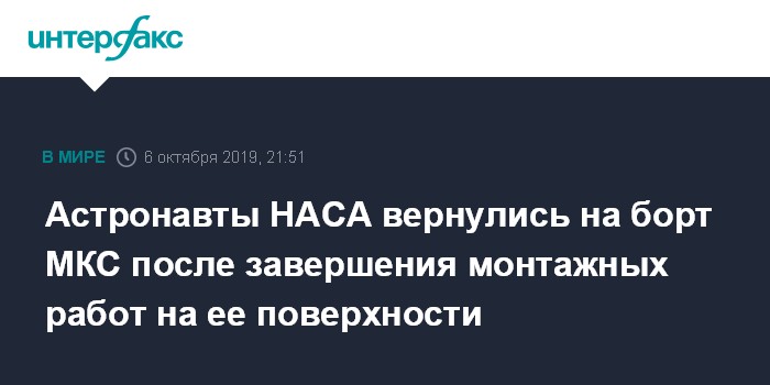Москва. 6 октября. INTERFAX.RU - Американские астронавты Кристина Кох и Эндрю Морган в воскресенье завершили многочасовой выход в открытый космос с борта Международной космической станции (МКС), в ходе которого они заменили аккумуляторы для ее солнечных панелей, сообщило Национальное управление США по аэронавтике и исследованию космического пространства (НАСА).