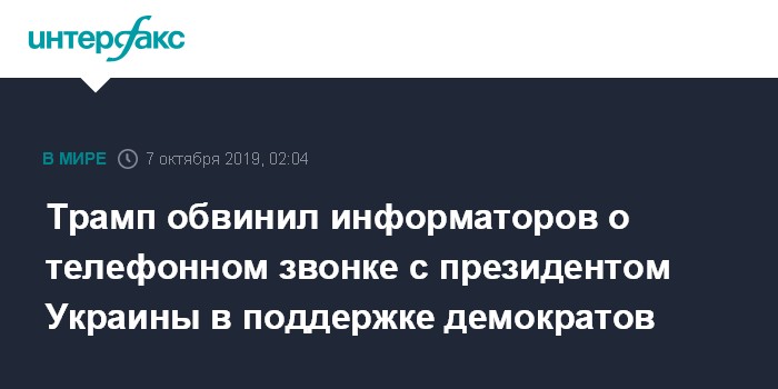 Москва. 7 октября. INTERFAX.RU - Президент США Дональд Трамп заявил, что два информатора по жалобе в связи с Украиной и их адвокат поддерживают демократов.