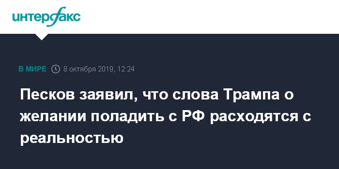 Песков обратил внимание, что смысл этого выражения - "поладить с Россией" - непонятен и до сих пор не раскрыт. По словам пресс-секретаря, "действительность наших двусторонних отношений (Москвы и Вашингтона - ИФ), к нашему сожалению, глубоко расходится с этими изначальными заявлениями Трампа". Песков добавил, что эта "действительность гораздо более печальная, и мы видим ежедневные проявления, которые еще более усугубляют атмосферу недоверия и местами напряженности между Москвой и Вашингтоном".