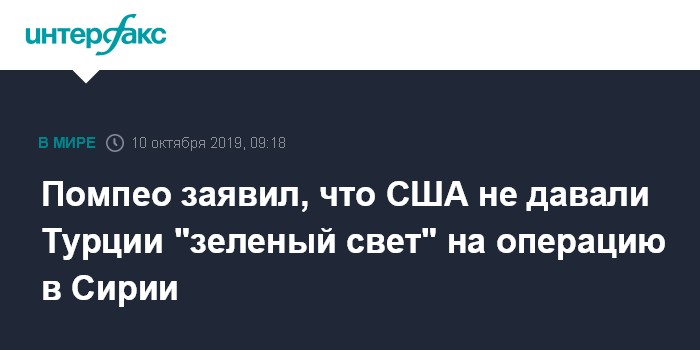 Москва. 10 октября. INTERFAX.RU - США не давали Турции "зеленый свет" для проведения операции на севере Сирии, заявил госсекретарь Майк Помпео в интервью PBS NewsHour.