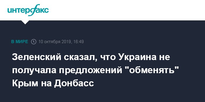 Москва. 10 октября. INTERFAX.RU - Президент Украины Владимир Зеленский утверждает, что ни в одном из переговорных форматов не было даже намека на то, чтобы в обмен на "освобождение оккупированной территории Донбасса" Киев признал Крым российской территорией.