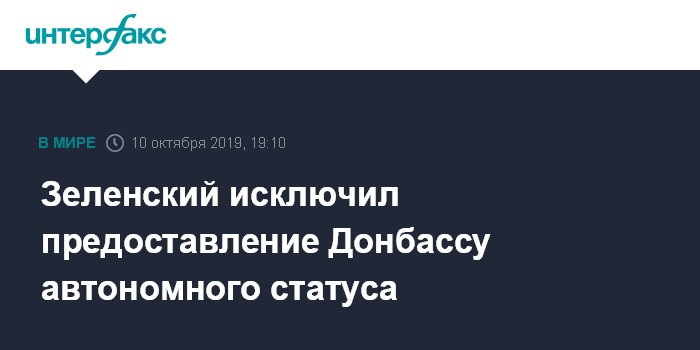 Москва. 10 октября. INTERFAX.RU - Президент Украины Владимир Зеленский заявил, что в тексте законопроекта об особенностях местного самоуправления на территориях отдельных районов Донецкой и Луганской областей не может идти речи об автономии Донбасса.
