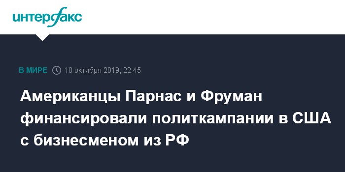 Ранее сообщалось, что в США по обвинению в нарушении правил финансирования избирательных кампаний арестовали бизнесменов Парнаса и Фрумана. Американские СМИ активно освещают эту тему, подчеркивая, что этих людей адвокат президента США Дональда Трампа Рудольф Джулиани называл своими клиентами.