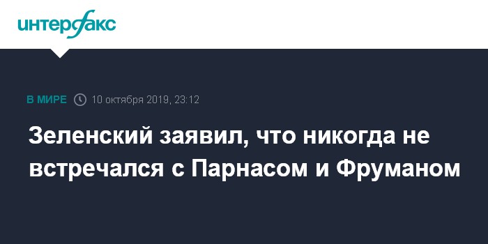 Москва. 10 октября. INTERFAX.RU - Президент Украины Владимир Зеленский заявил, что никогда не встречался с арестованными в США бизнесменами Львом Парнасом и Игорем Фруманом, которых адвокат президента США Дональда Трампа Рудольф Джулиани называл своими клиентами, и которые якобы пытались организовать его встречу с Зеленским.