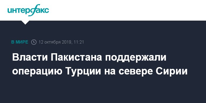 Москва. 12 октября. INTERFAX.RU - Правительство Пакистана выражает поддержку операции Турции "Источник мира", проходящей на северо-востоке Сирии, сообщают в субботу западные СМИ со ссылкой на заявление администрации пакистанского премьер-министра Имран Хана.