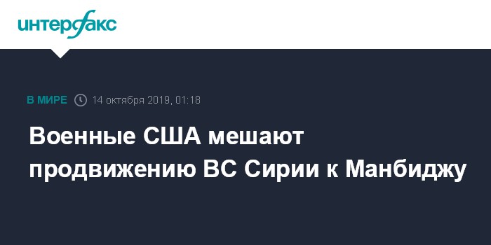 Москва. 14 октября. INTERFAX.RU - Американские военные препятствуют продвижению правительственных сил Сирии к городу Манбидж на севере страны, сообщают близкие к сирийским курдам СМИ.