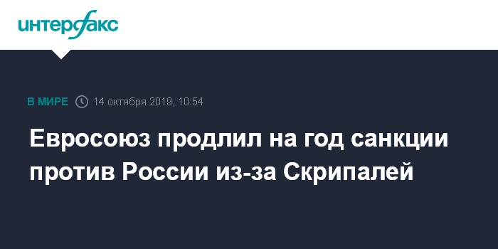 Москва. 14 октября. INTERFAX.RU - Совет Евросоюза продлил до 16 октября 2020 года санкции против России за применение химического оружия в Солсбери в марте 2018 года. Об этом говорится в пресс-релизе совета.