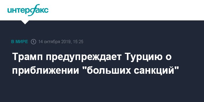 Москва. 14 октября. INTERFAX.RU - Президент США Дональд Трамп предупредил о подготовке масштабных санкций против Турции за то, что она проводит операцию на севере Сирии.