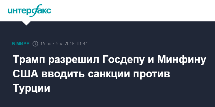 Москва. 15 октября. INTERFAX.RU - Президент США Дональд Трамп подписал указ, среди прочего, разрешающий Госдепу и Минфину США вводить ограничительные меры против Турции за ее военную операцию на севере Сирии, сообщил госсекретарь США Майк Помпео.