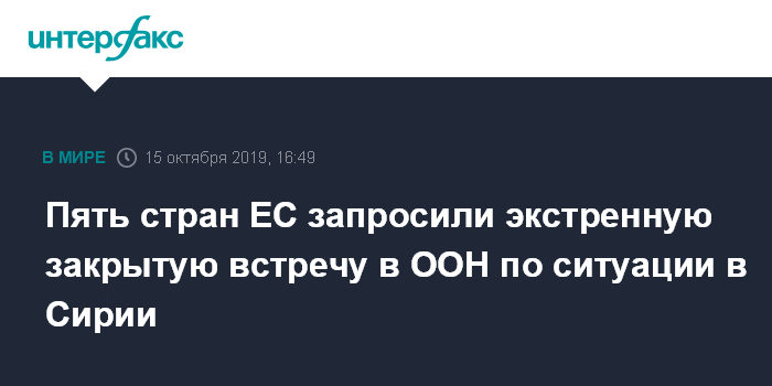 Москва. 15 октября. INTERFAX.RU - Пять европейских членов Совета Безопасности (СБ) ООН запросили на среду, 16 октября, проведение экстренной закрытой встречи в связи с военной операцией Турции на северо-востоке Сирии, сообщил "Интерфаксу" источник в штаб-квартире международной организации.