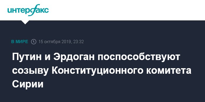 Москва. 15 октября. INTERFAX.RU - Главы России и Турции Владимир Путин и Реджеп Тайип Эрдоган в ходе телефонного разговора высказались за продолжение процесса политического урегулирования в Сирии, а также выразили намерение способствовать созыву в октябре Конституционного комитета под эгидой ООН, сообщила во вторник пресс-служба Кремля.