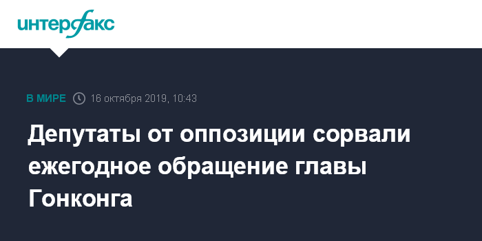 Москва. 16 октября. INTERFAX.RU - Депутаты от оппозиции помешали главе администрации Гонконга Кэрри Лам выступить с ежегодным обращением к парламенту. Как сообщает South China Morning Post, она прервала речь и ушла, а затем зачитала обращение на камеру, и его показали по телевидению.