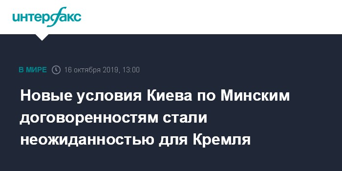 Москва. 16 октября. INTERFAX.RU - Заявление Киева о том, что условием выполнения Минских договоренностей является роспуск самопровозглашенных Донецкой и Луганской народных республик (ДНР и ЛНР), стало неожиданностью для Кремля и остальных участников "нормандского формата", заявил пресс-секретарь президента РФ Дмитрий Песков.