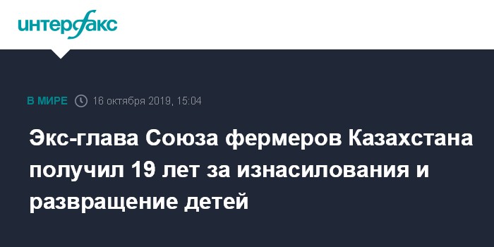 Москва. 16 октября. INTERFAX.RU - Специализированный межрайонный суд по уголовным делам Нур-Султана приговорил бывшего главу "Союза фермеров Казахстана" Ауезхана Даринова к 19 годам лишения свободы за преступления против половой неприкосновенности детей, сообщили "Интерфаксу" в пресс-службе суда в среду.
