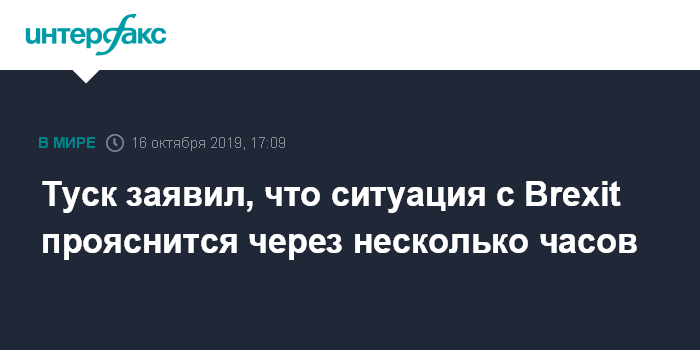 Москва. 16 октября. INTERFAX.RU - Председатель Европейского совета Дональд Туск в среду заявил журналистам, что ситуация с Brexit должна стать ясной примерно через семь-восемь часов, сообщают западные СМИ.
