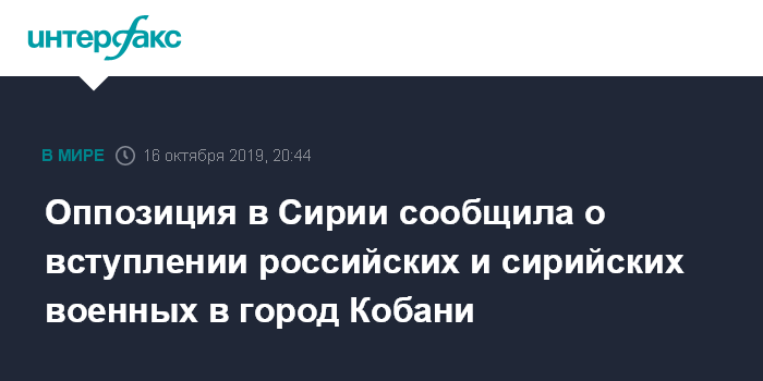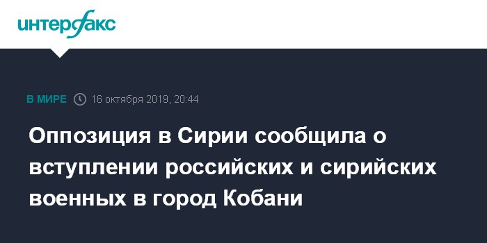 Москва. 16 октября. INTERFAX.RU - Сирийская арабская армия и военные РФ в среду вступили в пограничный с Турцией сирийский город Кобани, передают западные СМИ со ссылкой на информационные ресурсы, связанные с сирийской оппозицией.