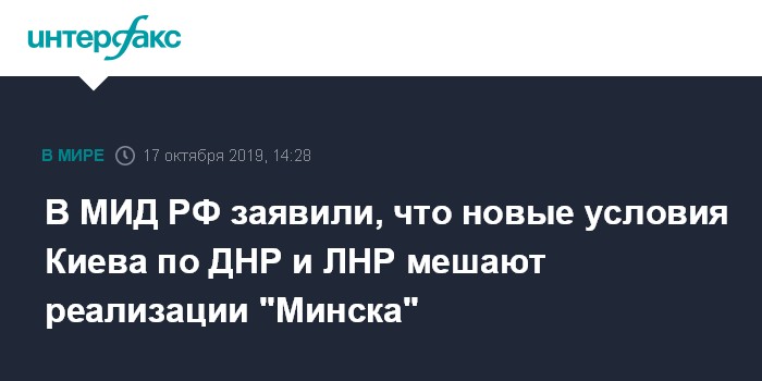 В минувший вторник, 15 октября, пресс-секретарь представителя Киева в контактной группе по Донбассу Леонида Кучмы Дарья Олифер заявила, что Киев готов выполнять политическую часть минских соглашений только после роспуска ДНР и ЛНР. Позднее пресс-секретарь президента РФ Дмитрий Песков признался, что новые условия Киева по Минским соглашениям стали неожиданностью для российских властей.