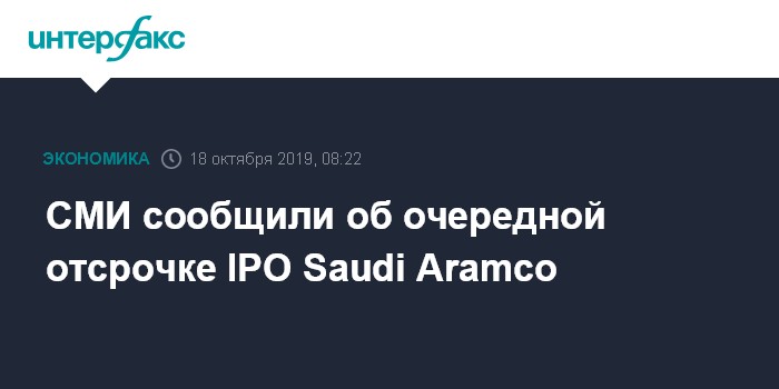 Москва. 18 октября. INTERFAX.RU - Саудовская государственная нефтекомпания Saudi Aramco отложила объявление о первичном размещении акций, сообщила Financial Times со ссылкой на три источника. Один из них сказал, что IPO отложили, но не отменили, а второй, что речь идет об отсрочке на несколько недель. Ранее предполагалось, что об IPO будет объявлено 20 октября.