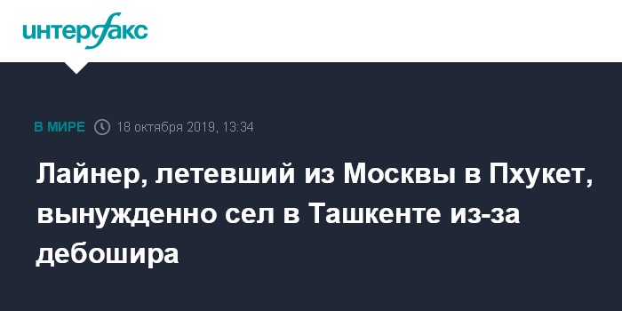 Москва. 18 октября. INTERFAX.RU - Самолет, следовавший из Москвы в Пхукет (Таиланд), вынужденно сел в Ташкенте из-за пьяного пассажира, который устроил дебош на борту, сообщила представитель столичного управления на транспорте Следственного комитета РФ (СКР) Елена Марковская.