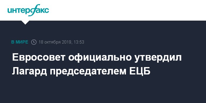Лагард сменит на этом посту Марио Драги с 1 ноября 2019 года, говорится в коммюнике Евросовета, распространенном в Брюсселе.