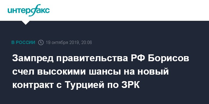 Москва. 19 октября. INTERFAX.RU - Вице-премьер РФ Юрий Борисов заявил о высокой вероятности нового контракта на поставку Турции российских зенитных ракетных комплексов (ЗРК).