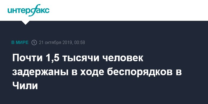 Москва. 21 октября. INTERFAX.RU - В ходе протестов в Чили в воскресенье задержаны 1 462 человека, сообщает местная радиостанция Bio Bio со ссылкой на чилийскую прокуратуру.